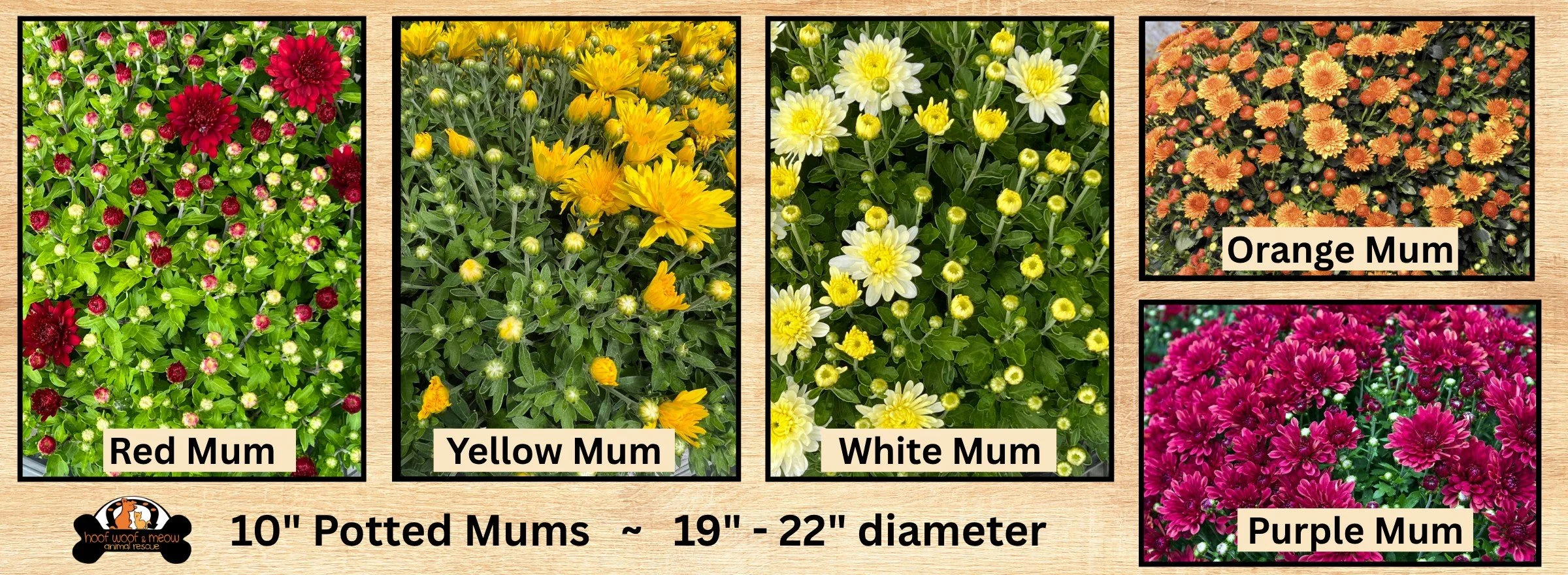 This season, Hoof Woof and Meow Animal Rescue is offering big, vibrant mums in gorgeous fall shades. Every plant you take home will brighten your porch or garden and help us provide food, medical care, and loving shelter for rescued pets waiting for their forever homes.